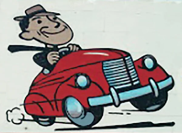 Fortunately, I had a lot of cardboard around the shop, including some super-thick stuff I had picked up at a graphics outlet and been holding onto for years, waiting for Just The Right Project. For inspiration, I turned to the line styles of the 1950’s and early-1960’s, my favorite era of cartoon design. The car was big and bulbous, with tall roof and large windshield opening. The plan was to have seats for driver and passenger on the dolly, with the other two actors simulating the back seat by standing behind the rest and leaning out to the sides.